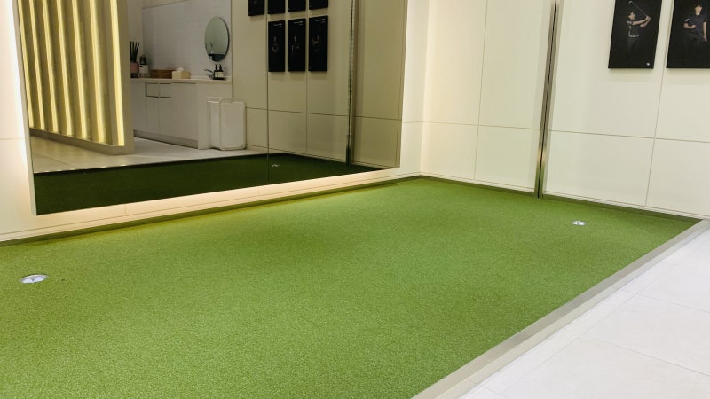 넓고 깔끔하게 준비된 퍼팅연습장, 왠지 넓은 실내연습장이 아니면 찾기 힘든 규모의 벽면 전신거울로 자세를 확인하며 연습하기 좋다!